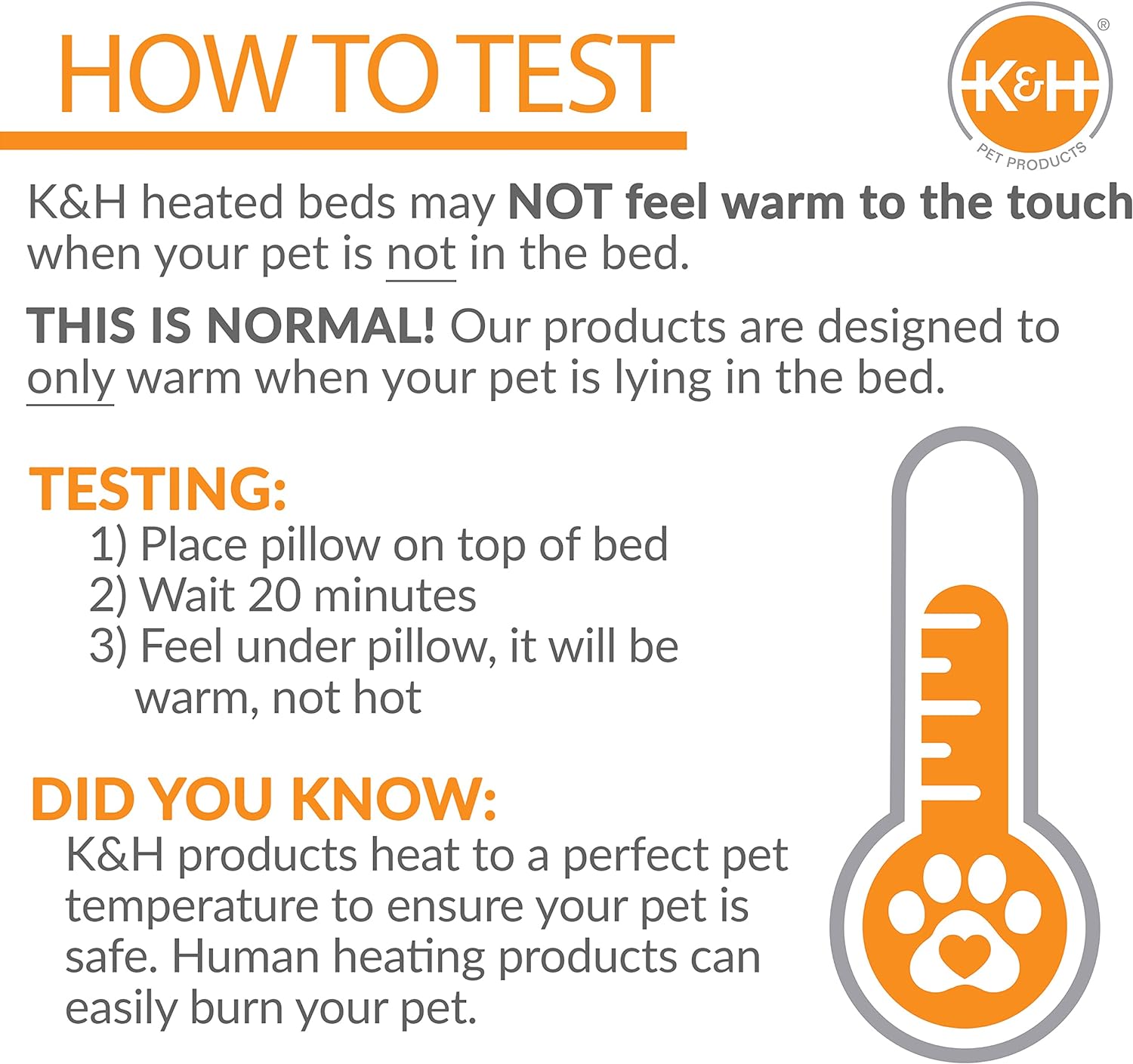 HOW IT WORKS: The heated bed may NOT feel warm to the touch when your pet is NOT in the bed; it emits a small amount of heat when not in use (pets can sense it), but only warms to max temperature when your pet is using the bed – see “How to Test” image